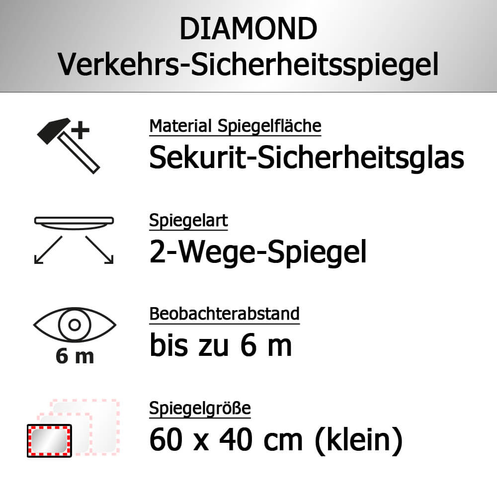 Der 60 x 40 cm große DIAMOND Verkehrsspiegel ermöglicht einen verzerrungsfreien Überblick an schwer einsehbaren Verkehrsstellen, wie Gebäudeecken, Ein- und Ausfahrten, Parkplätze, Laderampen und mehr. Um den Fahrer zum Blick in den Spiegel zu verleiten, besitzt dieser auffällige, rote Reflexstreifen. Das vormonierte Befestigungsset ermöglicht eine unkomplizierte und schnelle Montage an Rohrpfosten oder Wandarmen.