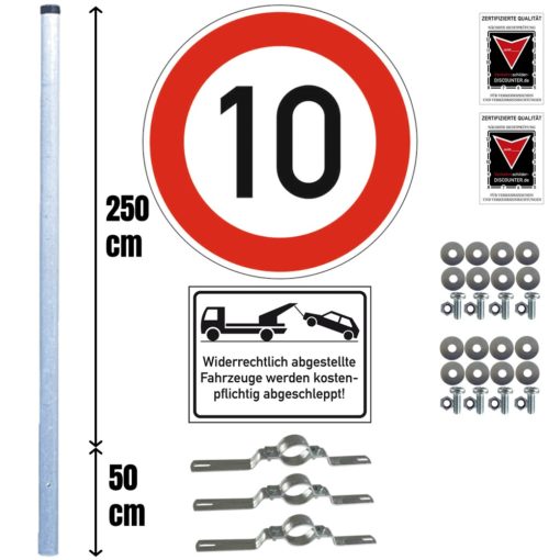 Komplett-Set 10kmh: 10kmh-Schild,Falschparker werden abgeschleppt und 3m Pfosten