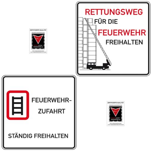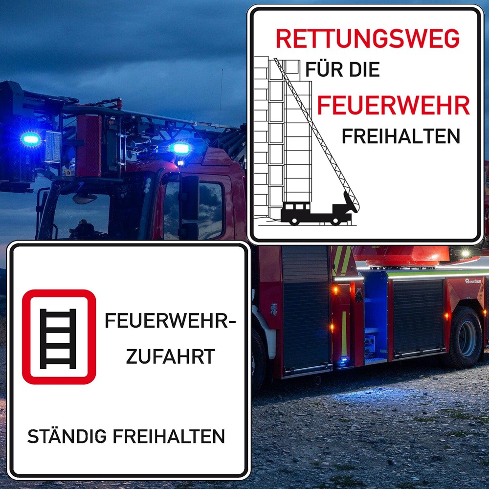In diesem Set erhalten Sie die Schilder ‚Rettungsweg für die Feuerwehr freihalten‘ und ‚Feuerwehr-Zufahrt ständig freihalten‘. Damit informieren Sie nicht nur Besucher und Mitarbeiter auf Ihrem Gelände, sondern es dient auch als Orientierung für die Rettungskräfte im Notfall. Die Schilder sind retroflektierend und daher optimal geeignet für Ihr Betriebsgelände.