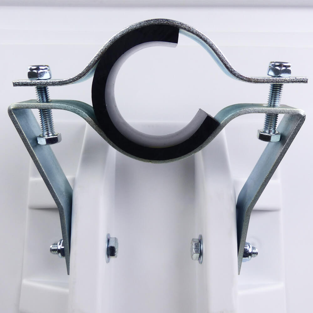 - eine zweiteilige, schwenkbare feuerverzinkte Rohrschelle aus Stahl für Rohre mit einem Durchmesser von 5 bis maximal 8,5 cm