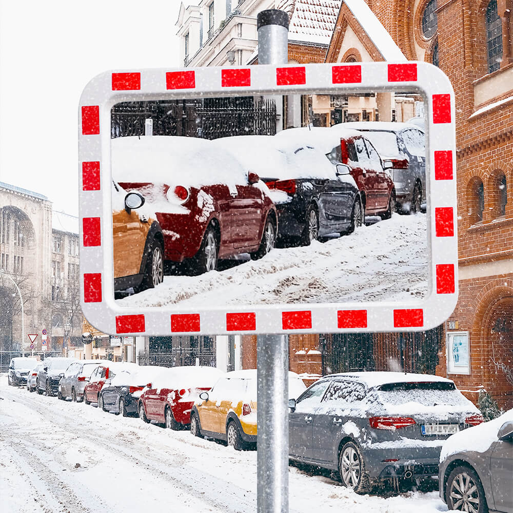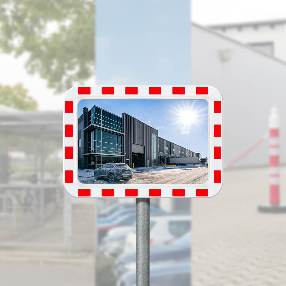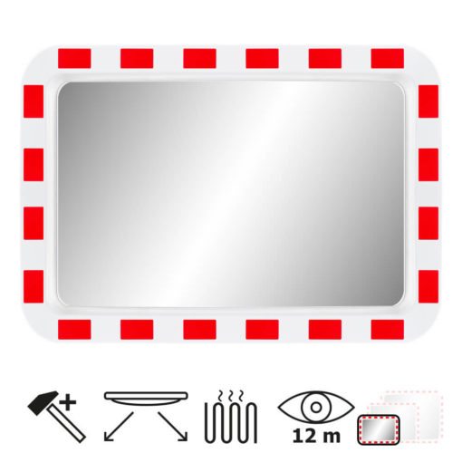 Der 60 x 40 cm große, beheizte Verkehrsspiegel in MIRAC Markenqualität ermöglicht einen verzerrungsfreien Überblick an schwer einsehbaren Verkehrsstellen, wie Gebäudeecken, Ein- und Ausfahrten, Parkplätze, Laderampen und mehr. Um den Fahrer zum Blick in den Spiegel zu verleiten, besitzt dieser auffällige, rote Reflexstreifen (RA1 Typ 1). Das vormonierte Befestigungsset ermöglicht eine unkomplizierte und schnelle Montage an Rohrpfosten oder Wandarmen.