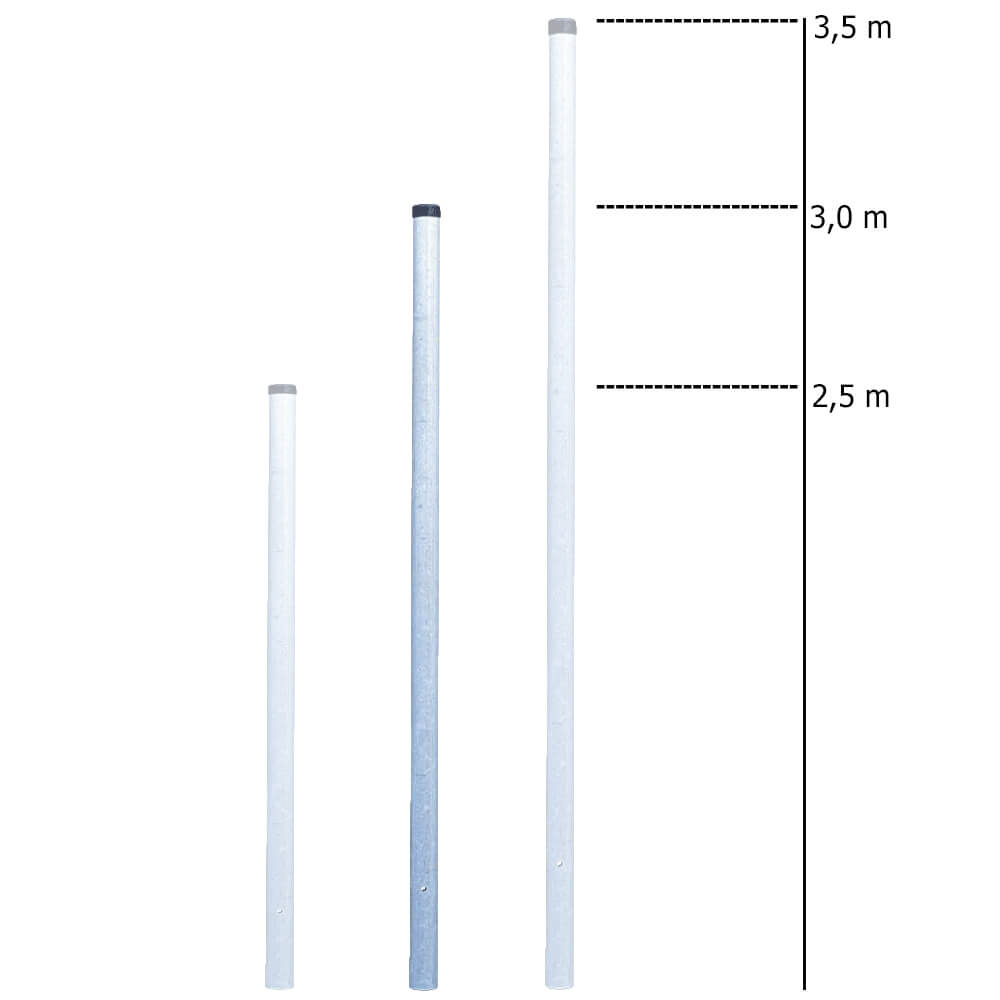 Pfosten und Rohrrahmen zum Einbetonieren: Diese Pfosten werden zwischen 500 – 700 mm einbetoniert. Wenn Sie einen Einbetonierpfosten ausgewählt haben, müssen sie noch 500 - 700 mm vom Gesamtmaß abziehen.