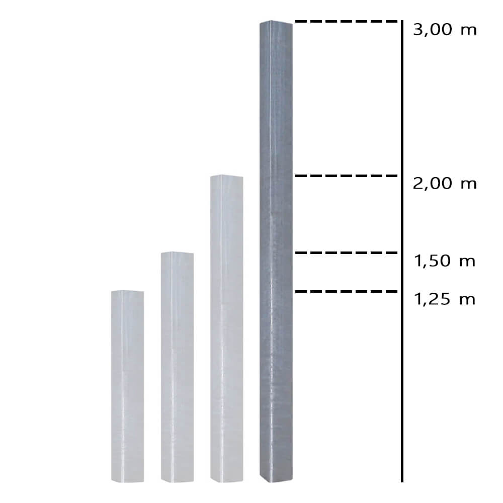 Pfosten und Rohrrahmen zum Einbetonieren: Diese Pfosten werden zwischen 500 – 700 mm einbetoniert. Wenn Sie einen Einbetonierpfosten ausgewählt haben, müssen sie noch 500 - 700 mm vom Gesamtmaß abziehen.
