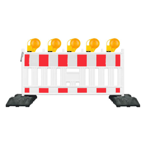Mit dem Set, bestehend aus einem Absperrschrankengitter Future aus witterungs- und UV-beständigem Kunststoff, zwei Fußplatten aus Recyclingmaterial und fünf BakoLight Warnleuchten, können Sie Baugruben wirkungsvoll absperren, Baustellen absichern oder ganze Straßen und Wege teil- oder vollsperren. Das modulare Schrankenzaunsystem kann beliebig erweitert werden, Kippbügel aus bruchsicherem Kunststoff verbinden die einzelnen Elemente sicher miteinander. Die einseitige, rot/weiße Folie ist retroreflektierend mit Reflexionsklasse RA2, sodass auch bei Nacht eine gute Sichtbarkeit im Straßenverkehr gewährleistet ist. Die Fußplatten aus Recyclingmaterial sorgen mit jeweils 29 kg Eigengewicht für eine besondere Stabilität und bieten dank verschiedener Einstecköffnungen viele Nutzungsmöglichkeiten. Die BakoLight LED überzeugt mit einer praktischen Dämmerungsautomatik, einem Linsendurchmesser von 20 cm für eine breite Lichtstreuung und wird mit nur 1 Batterie betrieben (nicht im Lieferumfang enthalten).