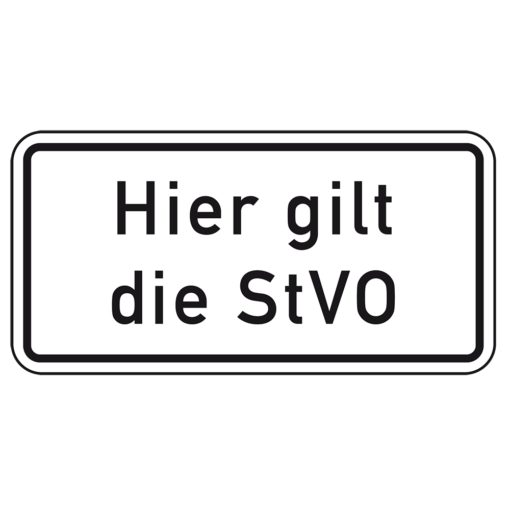 Das retroreflektierende Zusatzzeichen ‚Hier gilt die StVO‘ VZ 2803 ergänzt ein Verkehrszeichen um diese zusätzliche Information. Es kann auch alleine für sich stehen. Das weiße Schild aus 2 mm starkem Aluminium mit schwarzem Rand zeigt den schwarzen Text ‚Hier gilt die StVO‘.